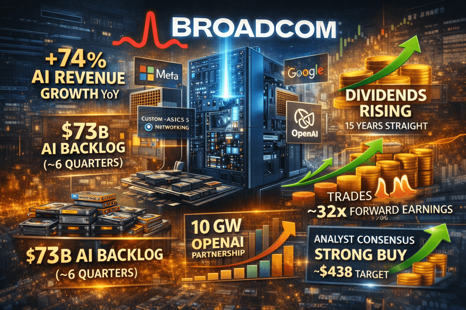 Although Google designs its own TPU (Tensor Processing Unit) architecture, Broadcom provides the bespoke networking ASICs and core infrastructure silicon that tie these systems together.